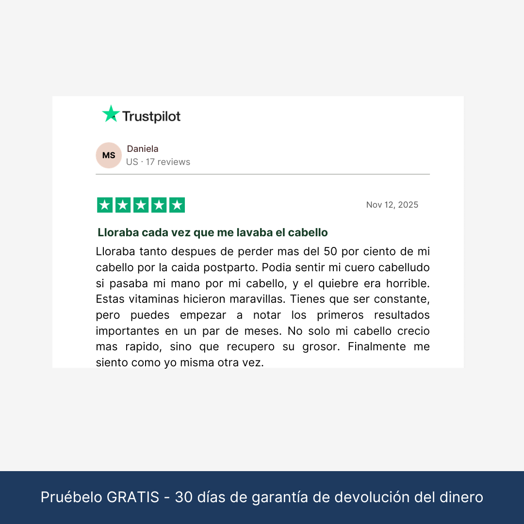 La mayoría de las mujeres notan menos caída en 2-4 semanas. El grosor visible y nuevo crecimiento aparecen alrededor de los meses 2-3. El cabello crece en ciclos, así que la constancia es clave—dale al menos 90 días.